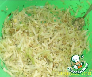 2. НАЧИНКА. Капусту шинкуем, лук нарезаем как можно мельче и всё это вместе жарим 5 минут. Закрываем крышкой и оставляем тушить еще 5 минут.