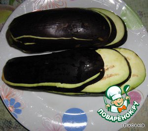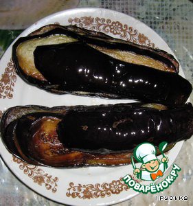 Каждый ломтик баклажана намазать поджаренным луком, морковью и помидорами. Сложить все в противень так, чтобы опять получился целый баклажан. Полить 1 ст.л. растительного масла. Запекать 10-15 минут при температуре 180 градусов.
