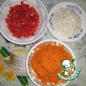 Морковь натереть на терке. Лук и помидоры нарезать.
