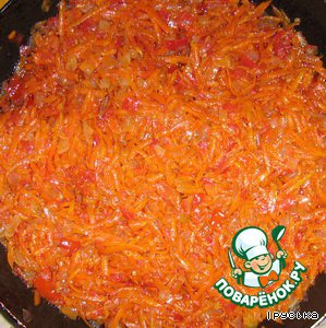Лук, морковь и помидоры соединить, обжарить на растительном масле, посолить и поперчить.