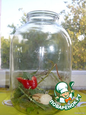 Все ингредиенты на трёх литровую банку. Укладываем на дно все специи.