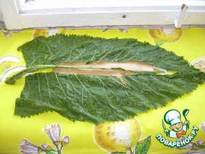 Листья хрена моем, вырезаем прожилку, деля лист пополам, затем режим на квадраты.