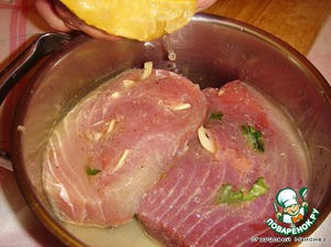 Заливаем кусочки рыбы лимонным соком и оставляем мариноваться минут на 10.