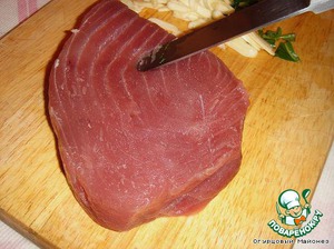 В каждом куске тунца делаем надрезы с обеих сторон, протыкая мякоть ножом.