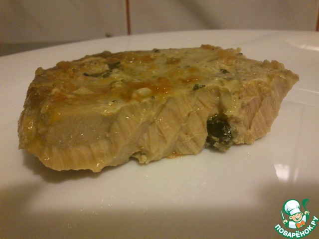 Нашпиговываем сделанные отверстия чесноком и базиликом. Рыбу натираем морской солью и чёрным перцем.