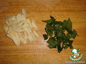 Три из четырёх зубчиков чеснока нарезаем тонкими дольками. Крошим базилик.