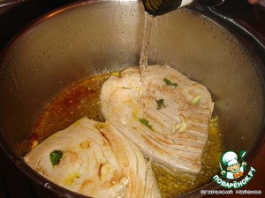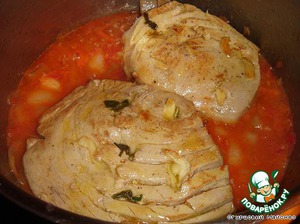 В кастрюле разогреваем оливковое масло, кладём тунец и равномерно обжариваем кусочки. Когда на рыбе образуется золотистая корочка (минут через 5-7), выливаем в кастрюлю белое вином и тушим на среднем огне. Как только вино почти полностью испарится, вынимаем рыбу из кастрюли и временно откладываем в мисочку, накрыв крышкой, чтоб не остыла.