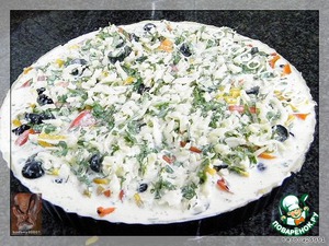 Заливаем пирог взбитой с сыром и травами заливкой.