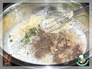 В отдельной посуде взбиваем вместе яйца со сливками,сыр, мелко нарезанную зелень и чеснок, солим и перчим по вкусу.