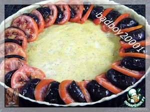 Помидоры нарезаем кружками, удаляем семена и жидкость.Затем выкладываем на тесто помидоры, чередуя с кусочками баклажан и