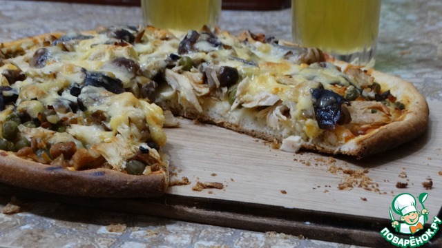 Для тонкой основы: замесить в ХП в режиме Пицца и сразу раскатывать, закладывать начинку и выпекать как обычно - нагреть духовку вместе с противнем до 210-220 С, положить пиццу на противень и выпекать до готовности - минут 15. Для толстой основы - полный цикл замешивания теста (у меня 2.20 ч)