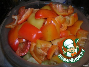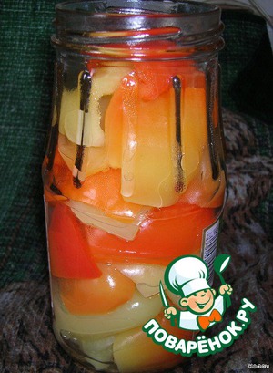 Перец бросить в маринад на несколько секунд, вынуть шумовкой в мисочку, потом сложить в банки.
