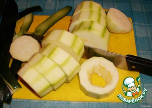Кабачки почистить, порезать на кольца толщиной 2-3 см., удалить сердцевину.
