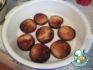 Баклажаны обжарить на растительном масле с двух сторон до золотистой корочки, посолить.