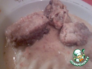 Столовую ложку муки размешиваем в небольшом количестве воды, чтобы не было комочков и заливаем тонкой струйкой в соус. Тушим 20 минут и подаем к столу))