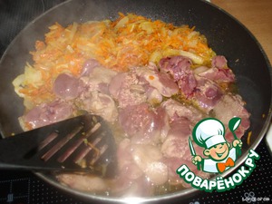 - печень промокаем бумажными полотенчиками и добавляем к овощам - всё обжариваем, пока печень не сготовится (должна изменить цвет, но ещё без корочки);