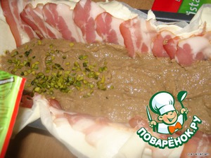 - форму "кирпичиком" застилаем тестом, тесто покрываем тонкими полосочками бекона - кладём половину печёночного пюре, сверху половину орехов, далее остаток пюре и оставшиеся орехи;