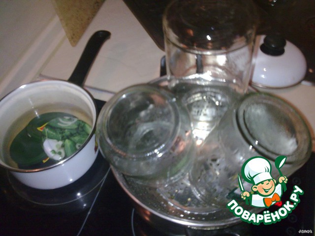 Банки и крышки помыть с содой, хорошо ополоснуть проточной водой и стерилизовать над паром банки, а крышки прокипятить.