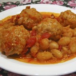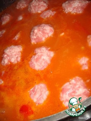В этот замечательный острый соус опускаем наши фрикадельки. Ничего особенного делать я вам с ними не предлагаю. Я просто отварила до полуготовности полстакана риса, промыла его и смешала с фаршем. Посолила, поперчила. Ничего больше не надо. Соус сам по себе насыщенный. Вы же можете приготовить фрикадельки как вашей душе угодно.