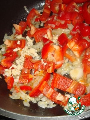 К луку добавляем мелко порезанный чеснок, крупно порезанный болгарский перец и перец чили острый, колечками.