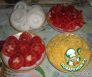 Помидоры и лук нарезать кольцами, а перец соломкой. Сыр натереть на терке.