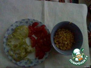тем временем взбить в миске яйца, добавить к ним сладкий перец, нарезанный колечками, посолить. Вылить смесь на сковородку и размешивать (в результате должен получиться не омлет, а яичная кашка)
