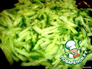 Огурцы трем на терке, немного солим и оставляем на 5 минут, чтобы лишняя жидкость ушла.