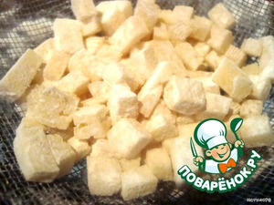 50 г сыра нарезаем кубиками, обваливаем в муке. Лишнюю муку "стряхиваем" с помощью сита.