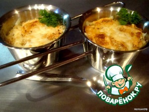 Кокотницы смазываем маслом, присыпаем панировочными сухарями, выкладываем будущий жюльен. Сверху присыпаем сухарями и сыром. Ставим в духовку запекаться до золотистой корочки.
