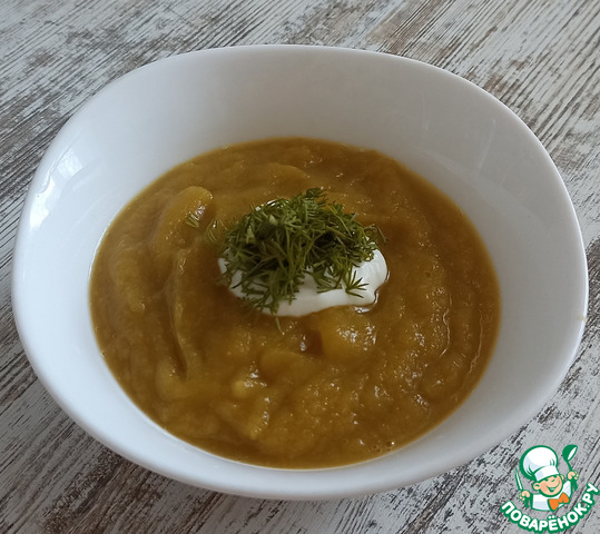 Я взяла достаточно крупный кабачок, почти 1 кг; из специй чёрный молотый перец и чеснок сушёный; из зелени петрушка и укроп. Измельчала готовые (=мягкие) овощи прямо в кастрюле погружным блендером. Варила овощи на сильном огне, под крышкой, около 30 минут. Вместо гренок - хлебцы