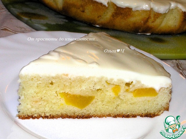 Персики порезать на дольки и выложить поверх теста в один слой. Выпекать при температуре 200С примерно 40 минут.