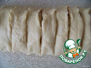 А далее скатываем тесто наподобие рулетика, и режем его ножом на полоски, толщиной сантиметра полтора – два.