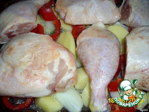 Очищенный картофель разрезать на половинки и уложить на дно формы. По верх картофеля высыпаю рис и укладываю нарезанную паприку, посолить, поперчить. Куриную голень разрезать на половинки, посолить и поперчить. Готовые куски курочки уложить на верх. Налить воды в форму, чтоб покрывало картофель. Запекать в хорошо нагретой духовке.
