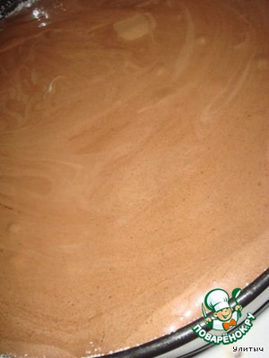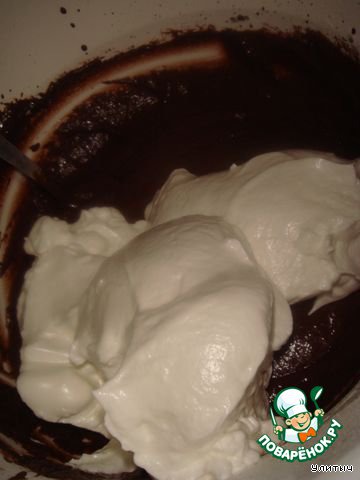 В готовое тесто вливаем растворенный какао-порошок, который успел за это время слегка остыть. Перемешиваем. Далее в полученную смесь аккуратно вводим белки.