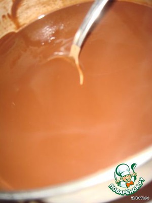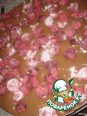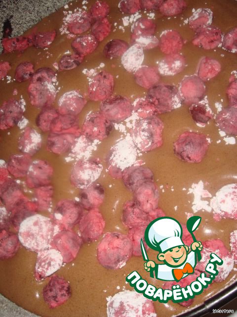 Наливаем в мисочку кипяток и растворяем в нем какао-порошок. Вишня должна быть у нас уже размороженная, отбрасываем на ситечко, даем стечь. Этот процесс не сфотографировала. Простите.