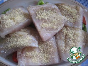 посыпаем сухарями (чем больше сухарей - тем больше масляного соуса останется на рыбке).