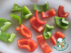 В огнеупорное блюдо выкладываем кусочки очищенного салатного перца,