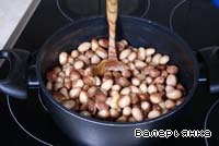 Фасоль замочить на ночь или оставить на час в воде, добавив чайную ложку соды. Воду слить, залить холодной водой и варить до готовности.