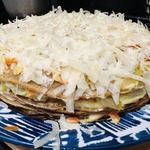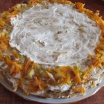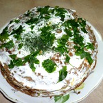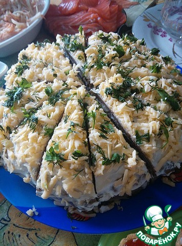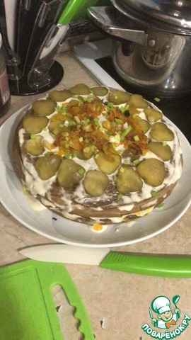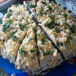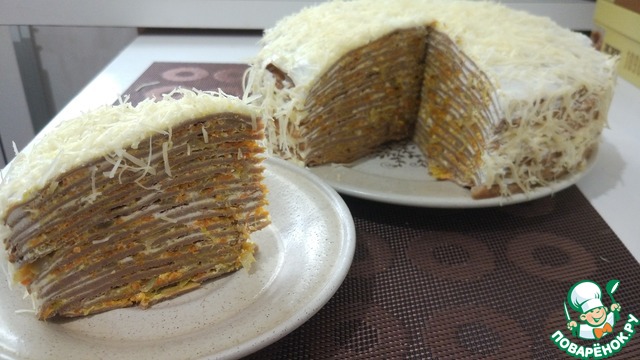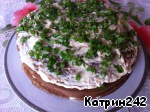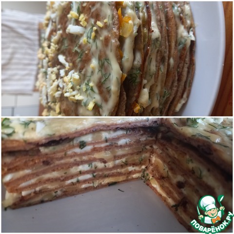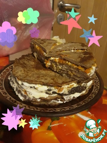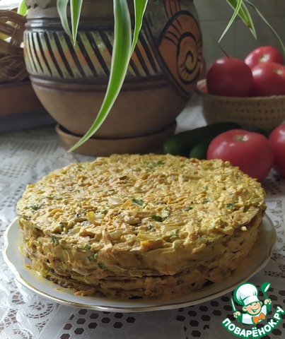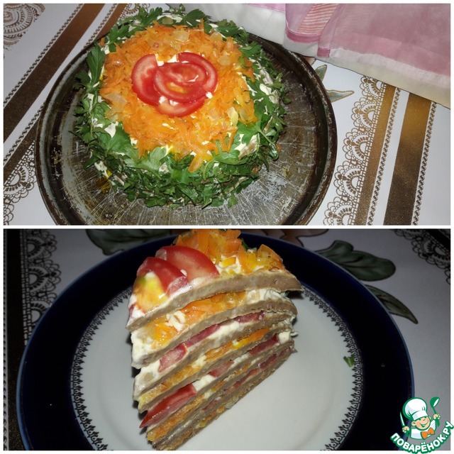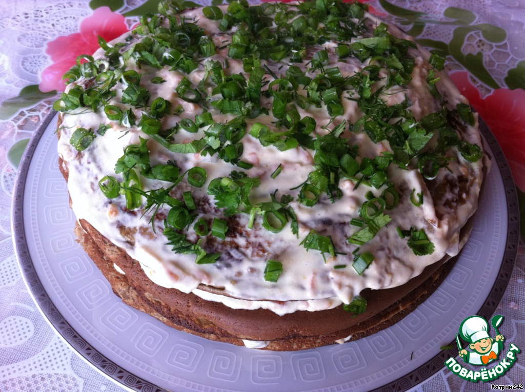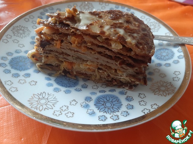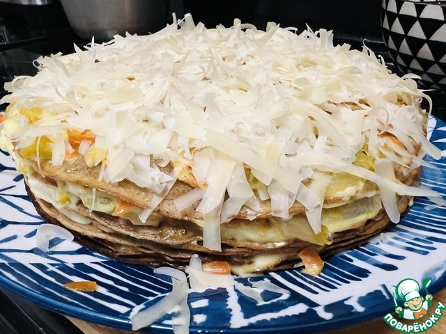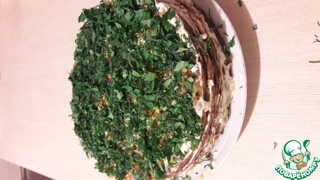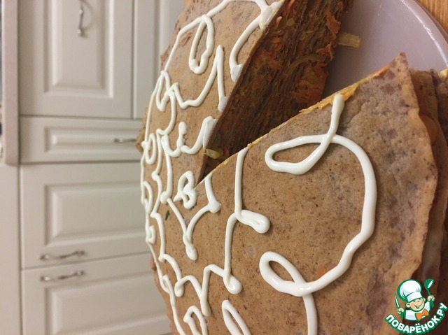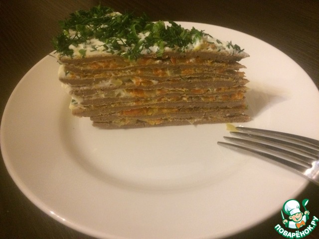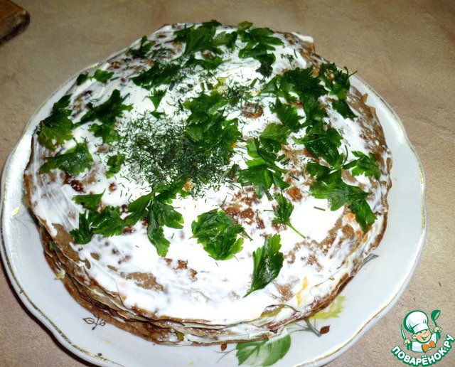 Поджаренные лепешки брать по одной, смазывать майонезом и выкладывать слой лука с морковью, затем накрывать следующей. Последнюю лепешку слегка смазать майонезом и посыпать мелко нарезанной зеленью. В этот раз я решила посыпать сыром, и получилось вполне органично.