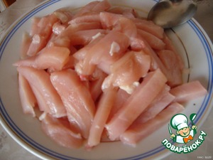 Филе грудки порезать и замариновать в соевом соусе на 1-2 часа