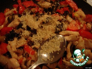 Затем обжарить баклажаны, добавить филе грудки, помидоры и кунжут.