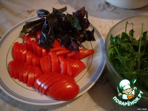 Порезать полукольцами помидоры и зелень.