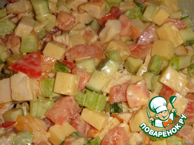 Несмотря на наличие куриного мяса и сыра, салат получился легким и сочным. Как всегда, мой любимый черешковый сельдерей... не обошлось и без него. Готовится такой салат в считанные минуты, получается очень вкусный. При желании можно проявить фантазию и украшательские способности, тогда и на праздничный стол не стыдно будет поставить.