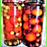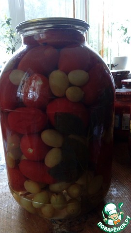 Берем чистую банку (не стерелизованную) укладываем все специи (кроме соли, сахара и уксуса). После в любом порядке накладываем в банку помидоры и виноград. Я закрываю все овощи 3-х кратной заливкой (без стерелизации).