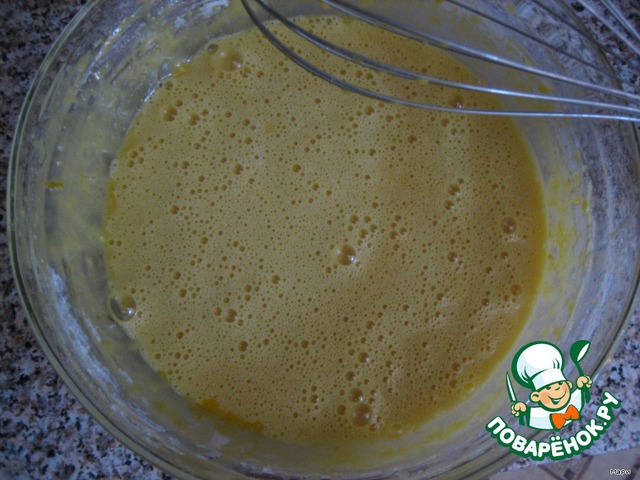 Потом, отдельно, взбить хорошенько миксером 5 яиц , добавить стакан сахара, ванильного сахара, если-бы еще не забыть, все это взбиваем, далее следует мука. Все взбиваем до состояния густой сметанки.