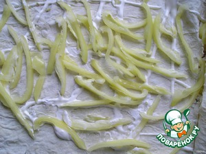 На разолженный лавашный лист нанести немножно сметанки и покрыть тоненькиим полосочками перчика