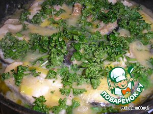 Затем кладем туда запеченную рыбу,желательно чтобы она была утоплена в соусе. Для этого просто поливаем ее соусом в сковородке. Накрываем крышкой и тушим до готовности. За несколько минут до снятия с огня бросаем мелко порезанную зелень.