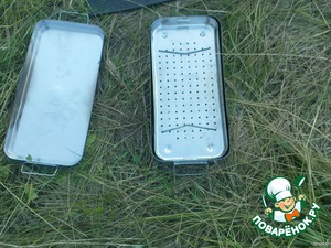 Займёмся коптилкой!Раскладываем её,на дно укладываем кусочки лимона,лавровый лист,перец