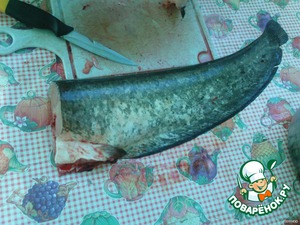 Берём распотрашённую и промытую тушку сома и разрезаем на порционные кусочки