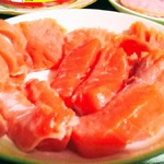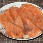 Убираем косточки и нарезаем тоненькими пластинками под углом 45 градусов, срезаем прямо с кожи.